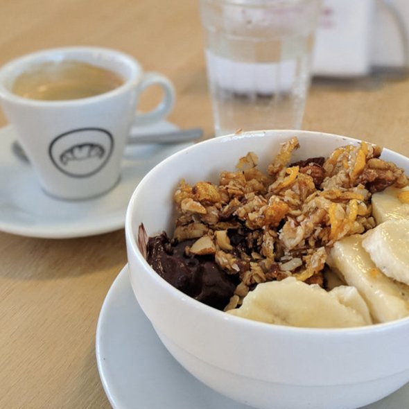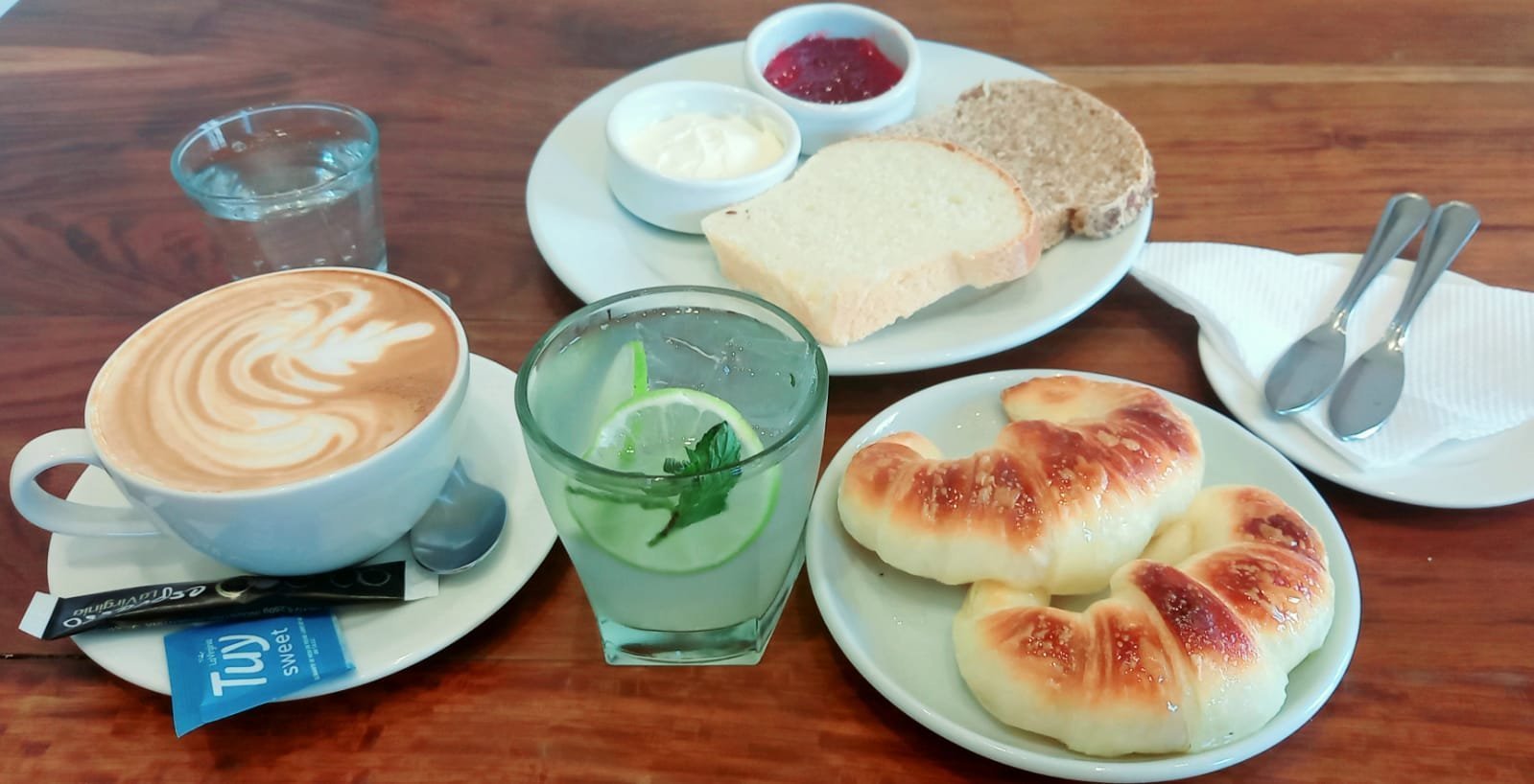 Café con leche, limonada, 2 medialunas calentitas o 1 rellena, tostadas para untar. Opción pan integral @Panadares