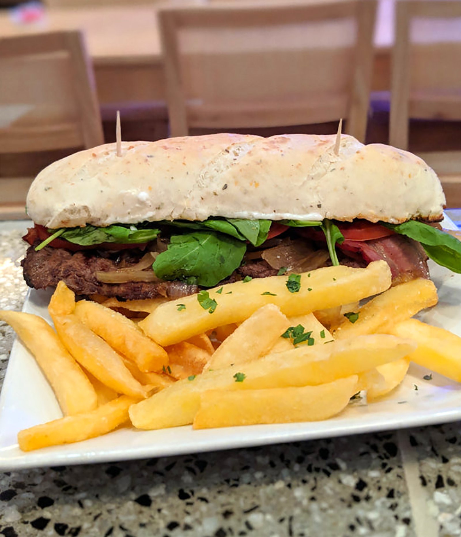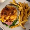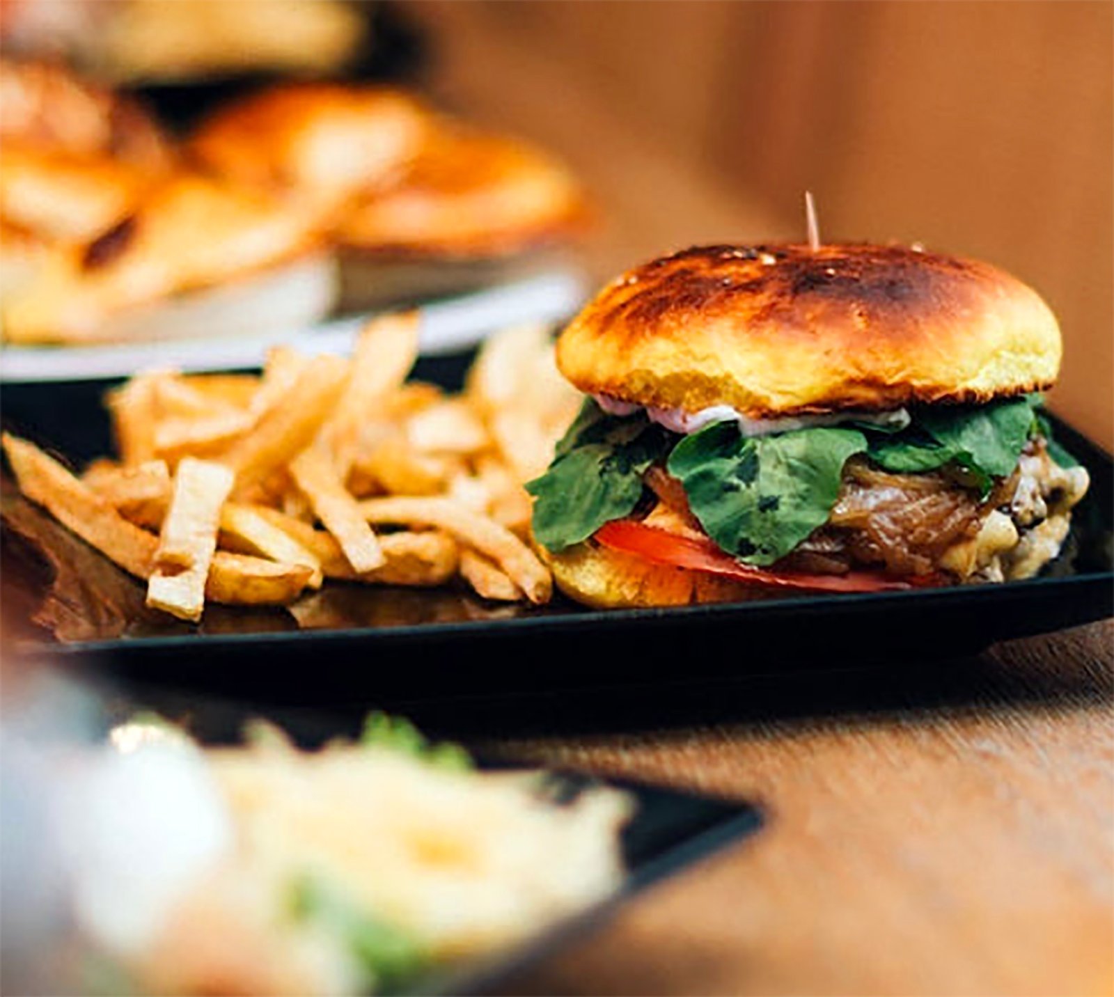 Pan de la casa, burger, queso azul, tomates secos, cebolla caramelizada y aderezo de la casa