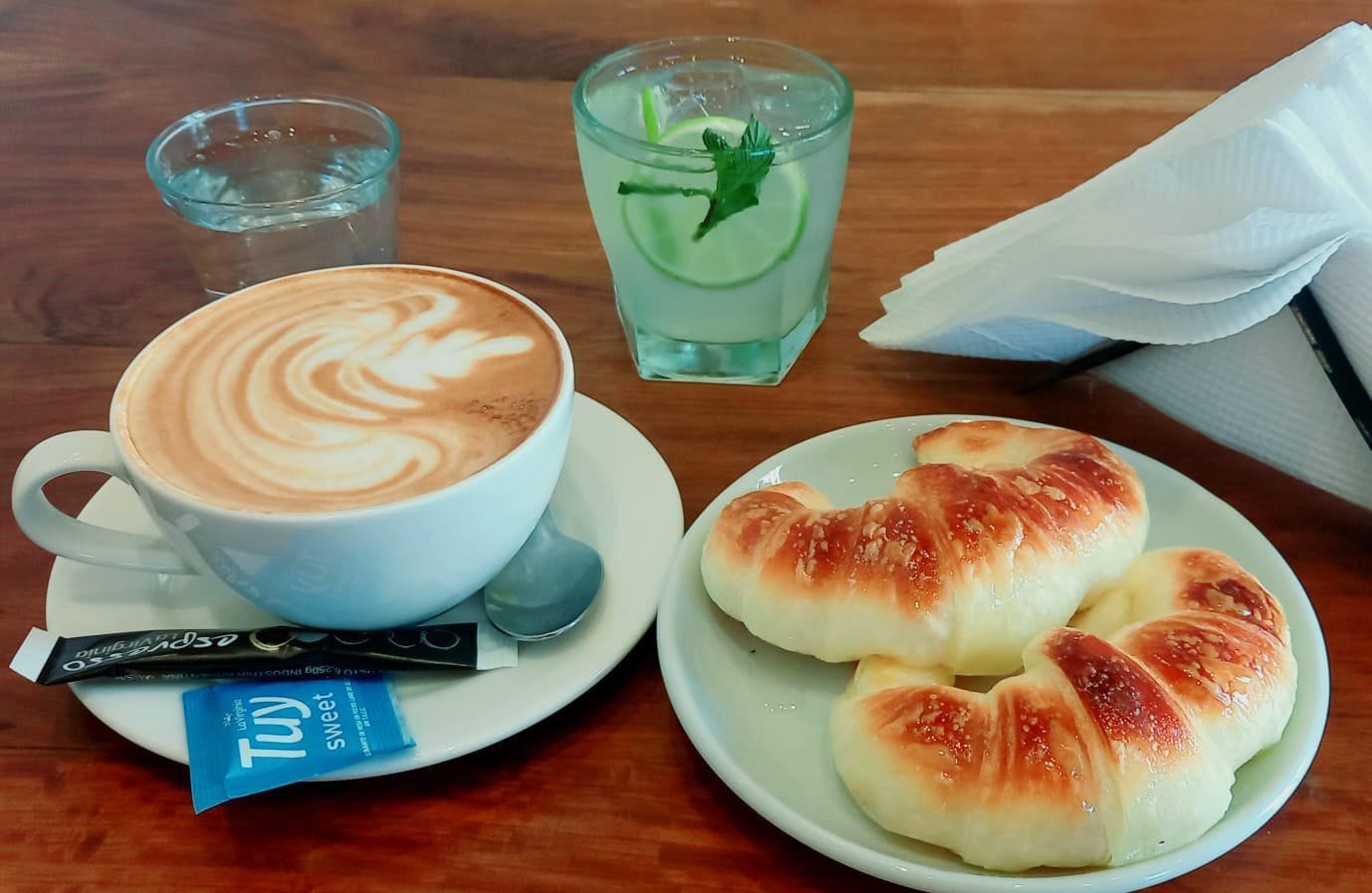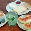 2 café con leche, 4 medialunas calentitas o 2 rellenas, 2 limonadas y 1 tostado de jamon y queso