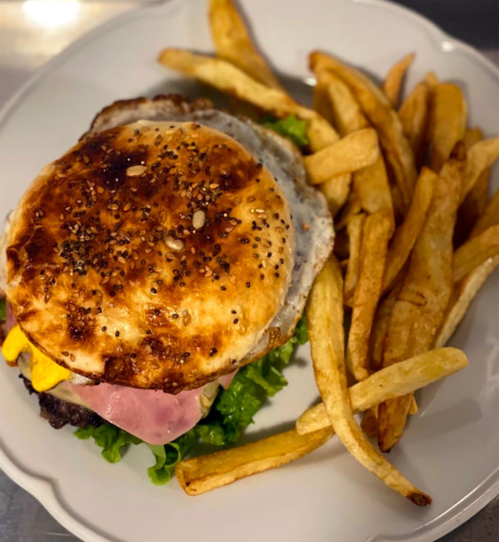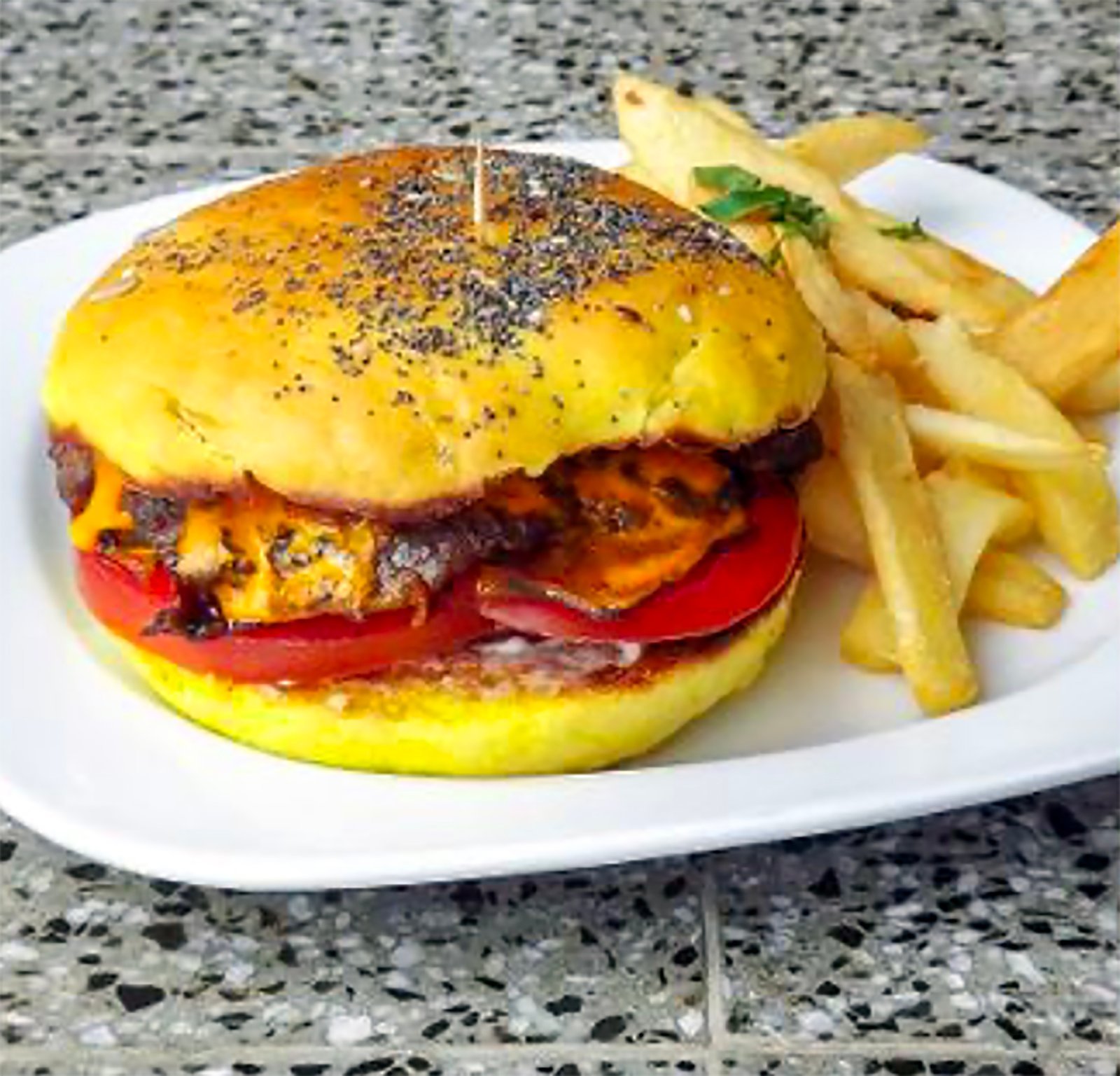 Pan de la casa, burger, cheddar, panceta, tomate y aderezo de la casa